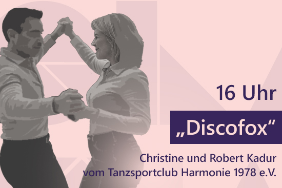 Am Nachmittag wird es klassisch: Um 16 Uhr zeigen Christine und Robert Kadur vom Tanzsportclub Harmonie 1978 e.V. den beliebten Discofox. Wer bei der nächsten Feier glänzen möchte, kann beim "Discofox" Workshop die leicht erlernbaren Tanzschritte einstudieren und zu schwungvoller Musik anwenden. In entspannter und lockerer Atmosphäre entstehen Freude am Tanzen und die Möglichkeit, Tanz als gemeinsames Erlebnis neu zu entdecken.