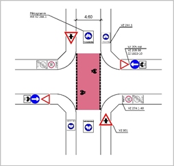Die Beschilderung in allen Knotenpunkten ist identisch zur Beschilderung an Beginn und Ende der Fahrradstraße zu wiederholen. Der Fahrradstraße soll in der Regel Vorfahrt eingeräumt werden. Knotenpunkte und alle anderen Einmündungsbereiche werden durch flächige rote Einfärbung hervorgehoben. Die Fahrbahnbegrenzung durch den Breitstrich ist im Knotenpunkt durch einen unterbrochenen Breitstrich fortzuführen.