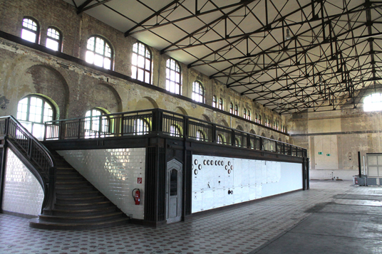 Auf die elektrische Schaltanlage mit Kontroll- und Steuerinstrumenten verweisen heute noch einige Marmortafeln an der Empore, dem ehemaligen Stand des Maschinenführers.